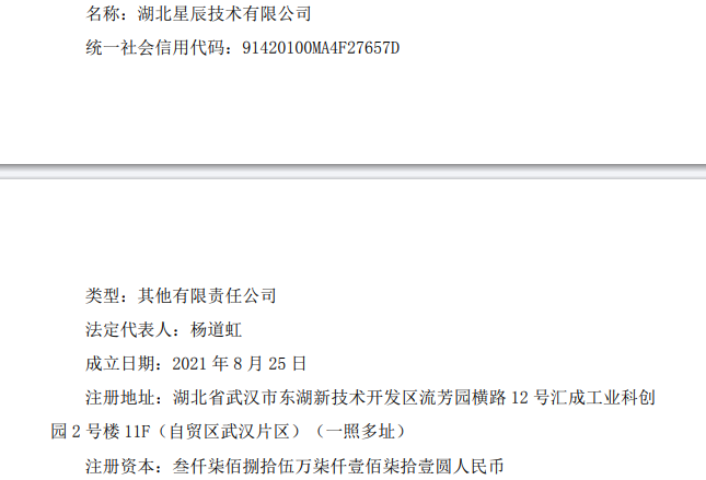 近日,湖北星辰已完成本次增资的工商登记手续,并取得武汉市市场监督管理局换发的《营业执照》,相关信息如下: