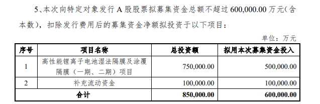 9月28日,星源材质发布公告称,将向特定对象发行A股股票,拟募集资金总额不超过60亿元,用于建设“高性能锂离子电池湿法隔膜及涂覆隔膜(一期、二期)项目”以及补充流动资金。
