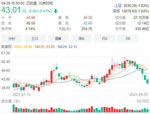 然而,受大盘整体走势影响,9月29日,星源材质报收43.01元/股,跌幅5.47%,总市值330.49亿元。