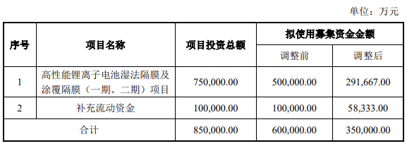 高性能锂离子电池湿法隔膜及涂覆隔膜(一期、二期)项目拟用本次募集资金投入金额调整后为29.17亿元,补充流动资金调整后为5.83亿元。