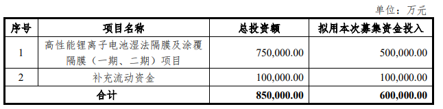 其中,高性能锂离子电池湿法隔膜及涂覆隔膜(一期、二期)项目拟用本次募集资金投入50亿元,10亿元将被用于补充流动资金。