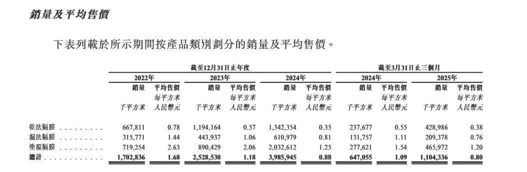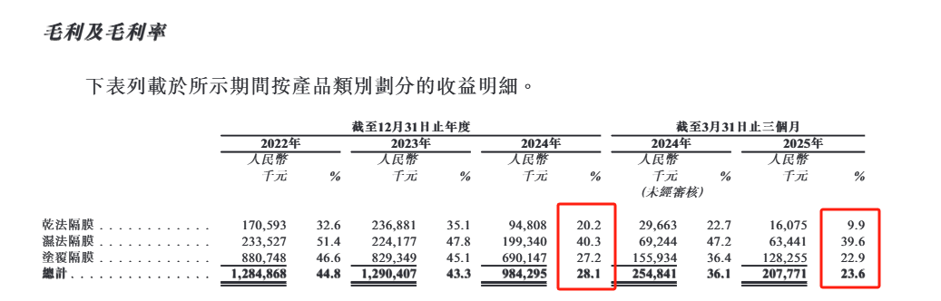 据招股书披露,2024年,星源材质的干法隔膜、湿法隔膜、涂覆隔膜平均售价分别暴跌至每平方米0.35元、0.81元、1.25元,同比下降26.92%、26.39%、21.67%;毛利率分别为20.2%、40.3%及27.2%,同比下滑14.9%、7.5%、17.9%。其中,涂覆隔膜的毛利率降幅最大,却占公司总营收的七成以上,直接导致该项下毛利减少了近1.4亿元。