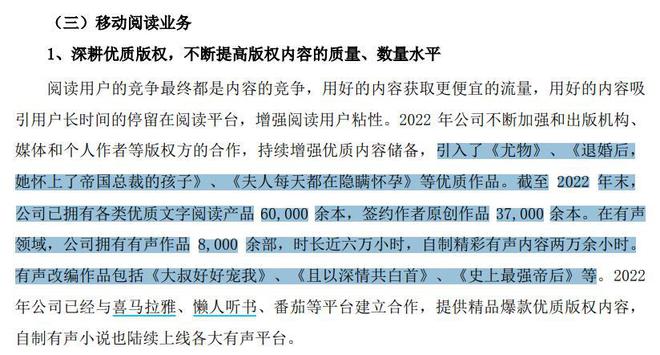 2022年公司不断加强和出版机构、媒体和个人作者等版权方的合作,持续增强优质内容储备,引入了《尤物》、《退婚后,她怀上了帝国总裁的孩子》、《夫人每天都在隐瞒怀孕》等优质作品……