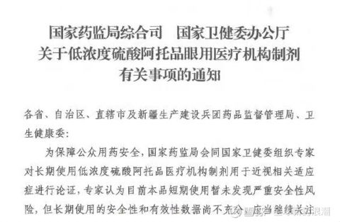 6日晚间,又有一则《关于低浓度硫酸阿托品眼用医疗机构制剂有关事项的通知》的截图在社交平台流传,其中称,为保障公众用药安全,国家药监局会同国家卫健委组织专家对长期使用低浓度硫酸阿托品医疗机构制剂用于近视相关适应症进行论证,专家认为目前本品短期使用暂未发现严重安全性风险,但长期使用的安全性和有限性数据尚不充分,应当继续关注。