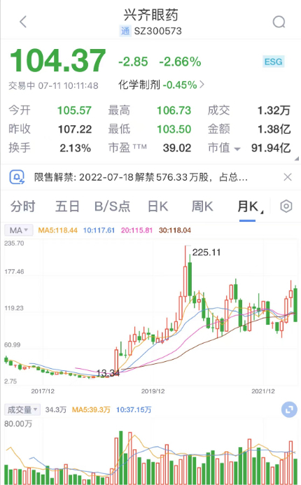 截至时代周报7月11日发稿前,兴齐眼药当日股价。(图片来源:新浪财经截图)