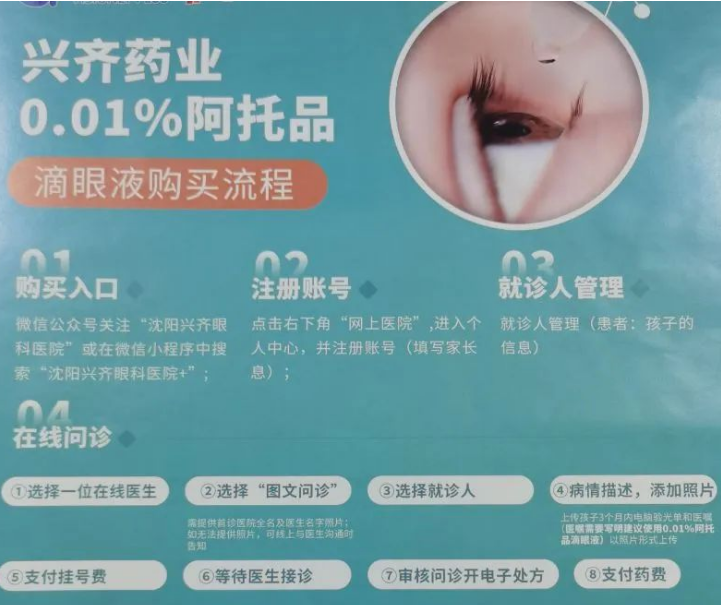 记者在体验兴齐眼科医院的购药流程时发现,就诊人需提供首诊医院全名及医生名字照片,并上传需用药儿童3个月内的电脑验光单和医嘱,等待审核问诊并开具电子处方后,就诊人支付药费即可远程获得阿托品滴眼液。