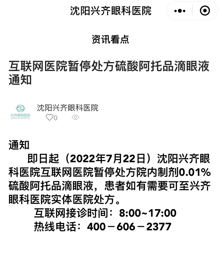 “互联网诊疗限制开具阿托品”终于被实锤。21日晚间,兴齐眼药(300573.SZ)全资子公司沈阳兴齐眼科医院发布公告称,自7月22日起,互联网医院暂停处方院内制剂0.01%硫酸阿托品滴眼液。