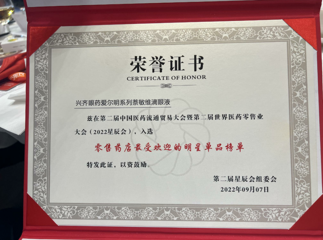 在大会发布的众多重磅榜单里,兴齐眼药收获满满。其中,兴齐眼药凭借在眼科药物领域的高速、高质量发展,自主创新能力和品牌口碑,荣登“品牌企业榜”;公司董事长刘继东以其敏锐的市场洞察力、行业趋势的精准判断以及在眼药领域做出的突出贡献,荣膺“医药工业领军人物”称号;公司产品爱尔明?萘敏维滴眼液依靠零售药店和大众消费者的双重认可,荣登“零售药店最受欢迎的明星单品榜”。