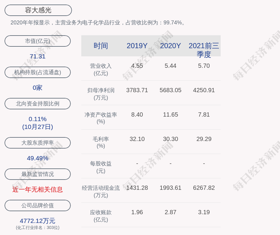 2020年年报显示,容大感光的主营业务为电子化学品行业,占营收比例为:99.74%。
