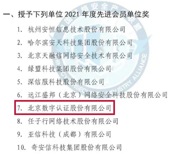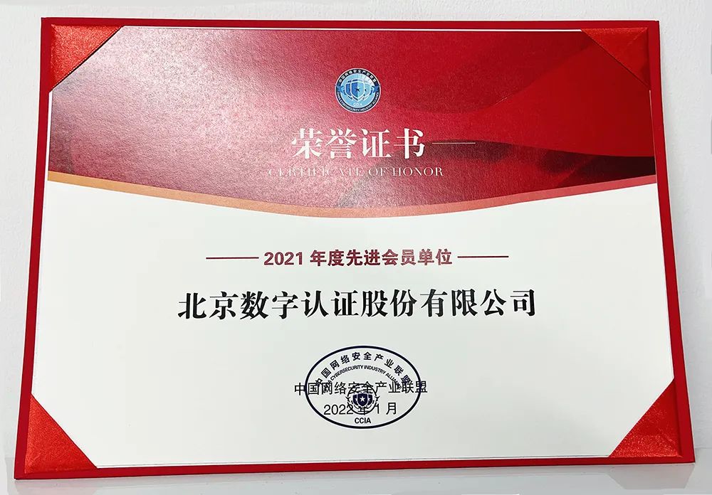 3月18日,2021年度中国网络安全产业联盟会员大会暨理事会在北京成功召开。北京数字认证股份有限公司(以下简称“数字认证”)凭借在2021年对联盟工作做出的积极贡献,经秘书处提名、常务理事会审议批准,荣获2021年度先进会员单位奖。