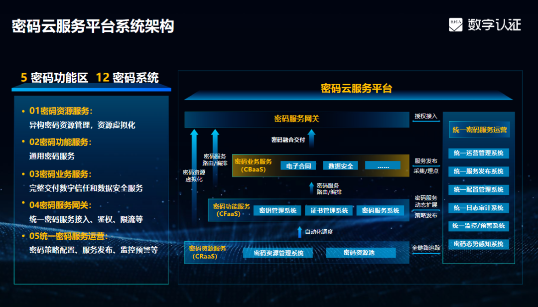 密码云服务平台可分为5大密码功能区、12个密码系统,对应云计算IaaS、PaaS、SaaS层不同的密码需求,分别提供不同层级的密码服务: