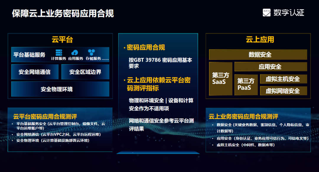 挑战四:合规难。国家《密码法》、GB/T 39786等法律法规明确要求,云平台和云上业务都要通过商用密码应用安全性评估。也就是说,在业务上云的同时,保障云上业务安全、合规,是企事业单位必需履行的法定义务。
