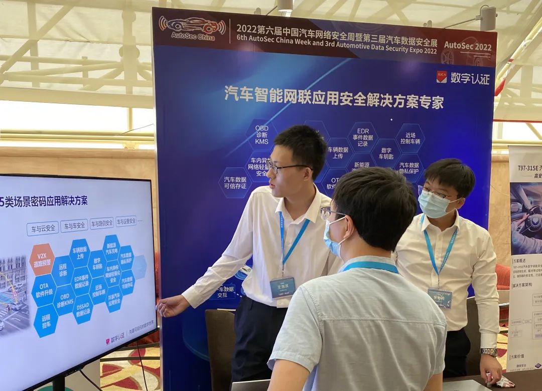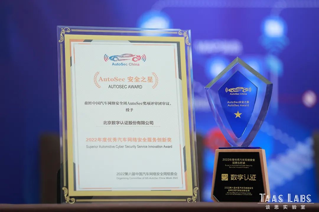 北京数字认证股份有限公司以“汽车智能网联应用安全解决方案专家”的身份受邀参会,在“AutoSec Award-安全之星”第三届中国汽车网络安全行业颁奖盛典环节,经过网络50万+投票和多轮评比,数字认证自主研发的V2X车联网网络信任服务平台从100多个创新方案和优秀汽车网络安全产品中脱颖而出,荣获主办方Taas Labs谈思实验室颁发的“年度优秀汽车网络安全服务创新奖”,获得众多与会嘉宾的一致好评。