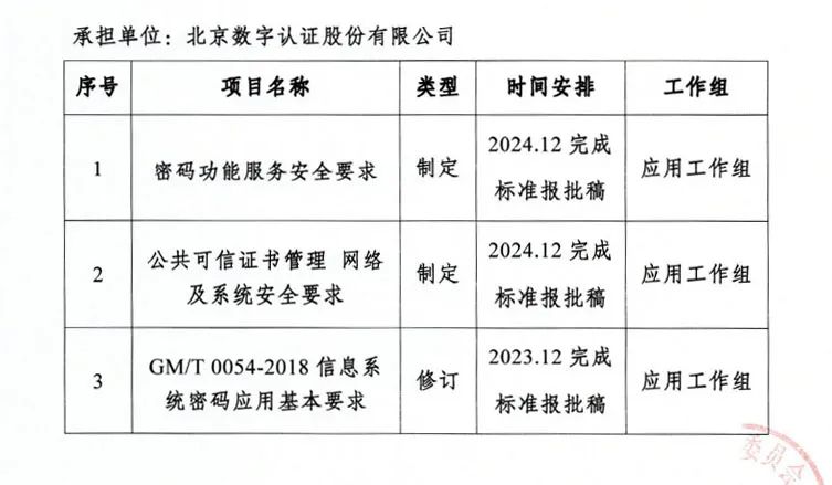 近期,密码行业标准化技术委员会下发了经国家密码管理局批准的2022年密码行业标准制修订计划(商用密码领域),北京数字认证股份有限公司(简称:数字认证)牵头三项密码行业标准获批立项,分别为《密码功能服务安全要求》、《公共可信证书管理网络及系统安全要求》及《GM/T 0054 信息系统密码应用基本要求》。