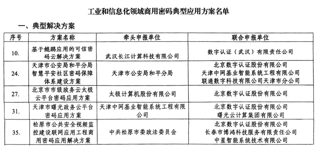 前不久,由工业和信息化部、国家密码管理局主办的“工业和信息化领域商用密码典型应用方案”征集活动进入评选环节。经过主办方严格审查并组织专家综合评审,最终确定了工业和信息化领域商用密码典型应用方案名单,并于日前公布。北京数字认证股份有限公司作为联合申报单位报送的五项商用密码应用方案全部入选。