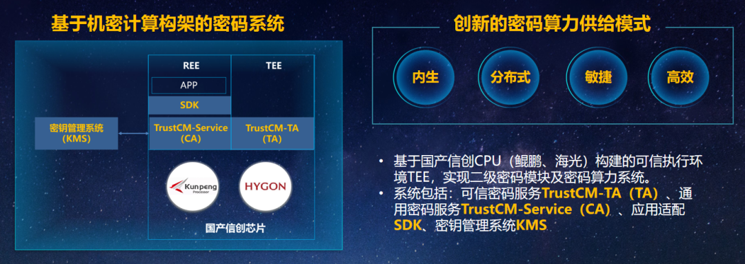林雪焰强调,数字认证“鲲密”密码算力平台,是分布式、内生的新型密码算力供给方案。基于国产信创CPU(鲲鹏、海光)构建的可信执行环境(TEE),实现的具有资质的二级密码模块,形成新型密码算力供给系统,具有内生、分布式、敏捷、高效四大显著优势,即:密码算力内生于芯片的可信执行环境中,基于“用、管”分离支撑大规模分布式密码计算,由软件定义密码实现密码能力随需应变,高性能密码算力和适应密评要求的快速交付。“鲲密”密码算力平台在金融领域具有丰富的创新空间,比如合规的内生密码实现软件定义SSL卸载、云原生环境下密码算力的高效供给、密态数据库实现端到端的数据加密等。同时,这种创新的密码供给模式对于边缘计算、隐私计算、云密码服务、数据安全等各类应用场景皆有广阔的想象和使用空间。