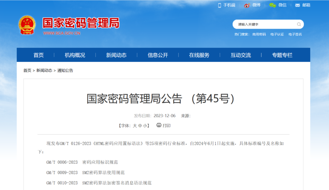 近日,国家密码管理局公告发布25项密码行业标准,并将于2024年6月1日起正式实施。其中,北京数字认证股份有限公司(简称:数字认证)牵头2项,参编12项。