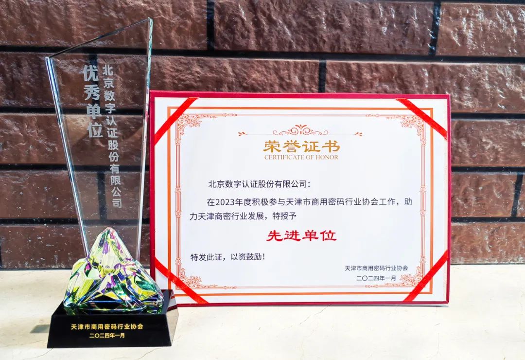 在论坛上,数字认证还荣获天津市商用密码行业协会“先进单位”荣誉证书,这是对数字认证过去一年里积极参与天津市商用密码行业协会工作、助力天津商密行业高质量发展的认可与鼓励。