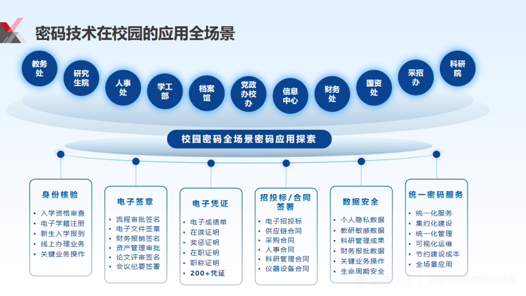 数字认证研究院院长夏鲁宁带来了《智慧校园密码应用建设实践》主题演讲。他表示,教育信息化正在向线上化、一体化、无纸化转移,其中,创新发展是内在驱动力,而电子签名是核心引擎,人们通过密码技术不断为智慧教学、智慧管理、智慧服务提供越来越多安全可信的安全服务。在此背景下,数字认证面向数字校园推出了可信密码服务解决方案,通过密码技术赋能教育数字化转型安全建设,助力高校实现了业务办理线上化、线上用户真实化、内容数据凭证化、师生证照电子化、档案归档无纸化、合同签署电子化、数据存储安全化、数据共享可控化、密码应用集约化。