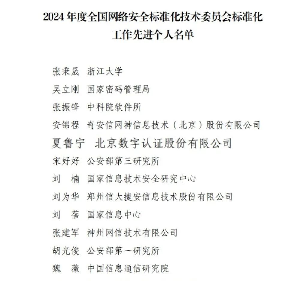 为表彰在2024年国家网络安全标准化工作中做出突出贡献的个人,4月1日,全国网络安全标准化技术委员会决定授予16名同志为“2024年度全国网络安全标准化技术委员会标准化工作先进个人”。北京数字认证股份有限公司(简称:数字认证)研究院院长夏鲁宁获此殊荣,这也是数字认证第四次摘得此项荣誉。