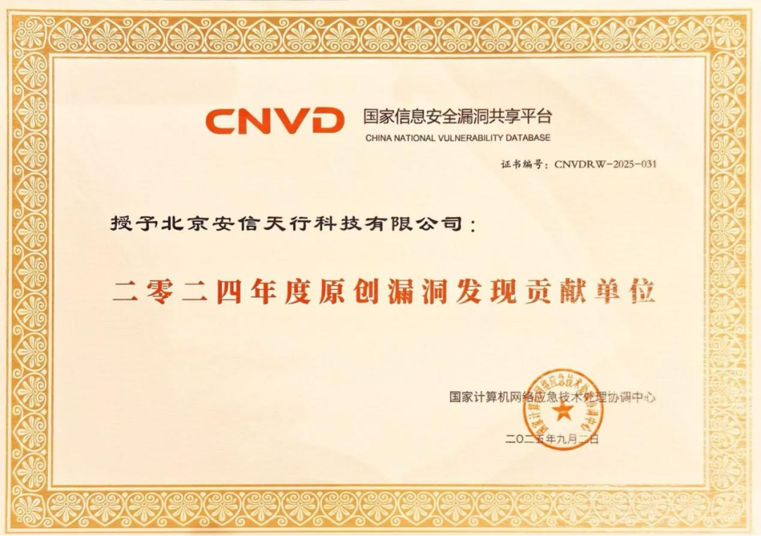 数字认证旗下子公司“北京安信天行科技有限公司”凭借在漏洞挖掘与报送工作中的突出表现,荣获CNVD “2024年度原创漏洞发现贡献单位”称号。