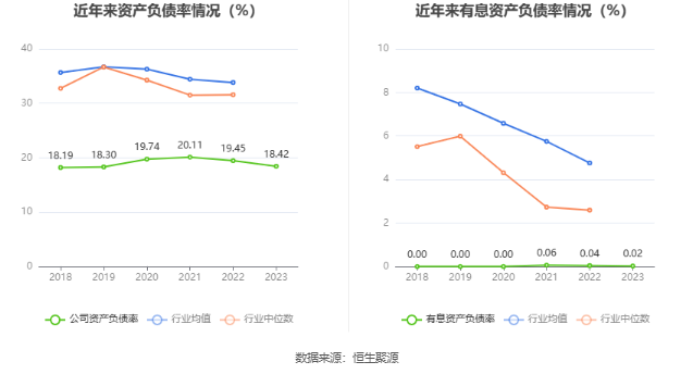 在偿债能力方面,公司2023年年末资产负债率为18.42%,相比上年末下降1.03个百分点;有息资产负债率为0.02%,相比上年末下降0.02个百分点。