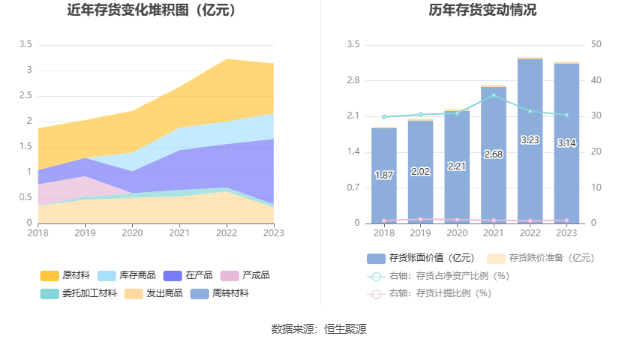 从存货变动来看,截至2023年年末,公司存货账面价值为3.14亿元,占净资产的30.43%,较上年末减少889.86万元。其中,存货跌价准备为294.53万元,计提比例为0.93%。