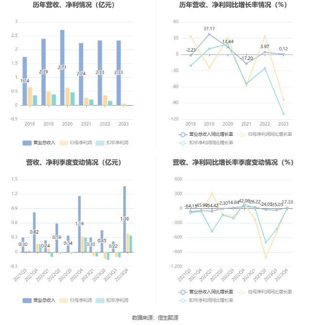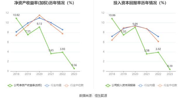 数据显示,2023年公司加权平均净资产收益率为0.56%,较上年同期下降3.37个百分点;公司2023年投入资本回报率为0.39%,较上年同期下降3.53个百分点。