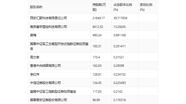 年报显示,2023年年末公司十大流通股东中,新进股东为姜梅、中信证券股份有限公司、国泰君安证券股份有限公司,取代了三季度末的中国国际金融香港资产管理有限公司-CICCFT10(R)、广发中证军工交易型开放式指数证券投资基金、郭富俊。在具体持股比例上,国泰中证军工交易型开放式指数证券投资基金、香港中央结算有限公司、富国中证军工指数型证券投资基金持股有所下降。