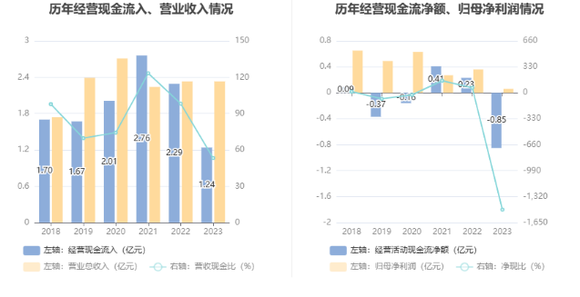 2023年,公司经营活动现金流净额为-8541.59万元,同比减少1.08亿元;筹资活动现金流净额-86.78万元,同比减少2.45亿元;投资活动现金流净额1.15亿元,上年同期为-1.48亿元。