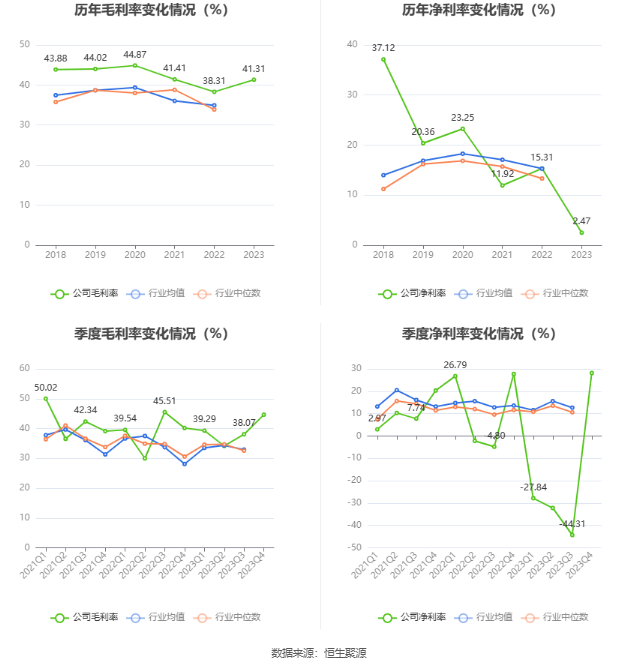 2023年,公司毛利率为41.31%,同比上升3.00个百分点;净利率为2.47%,较上年同期下降12.84个百分点。从单季度指标来看,2023年第四季度公司毛利率为44.63%,同比上升4.47个百分点,环比上升6.56个百分点;净利率为28.16%,较上年同期上升0.43个百分点,较上一季度上升72.47个百分点。