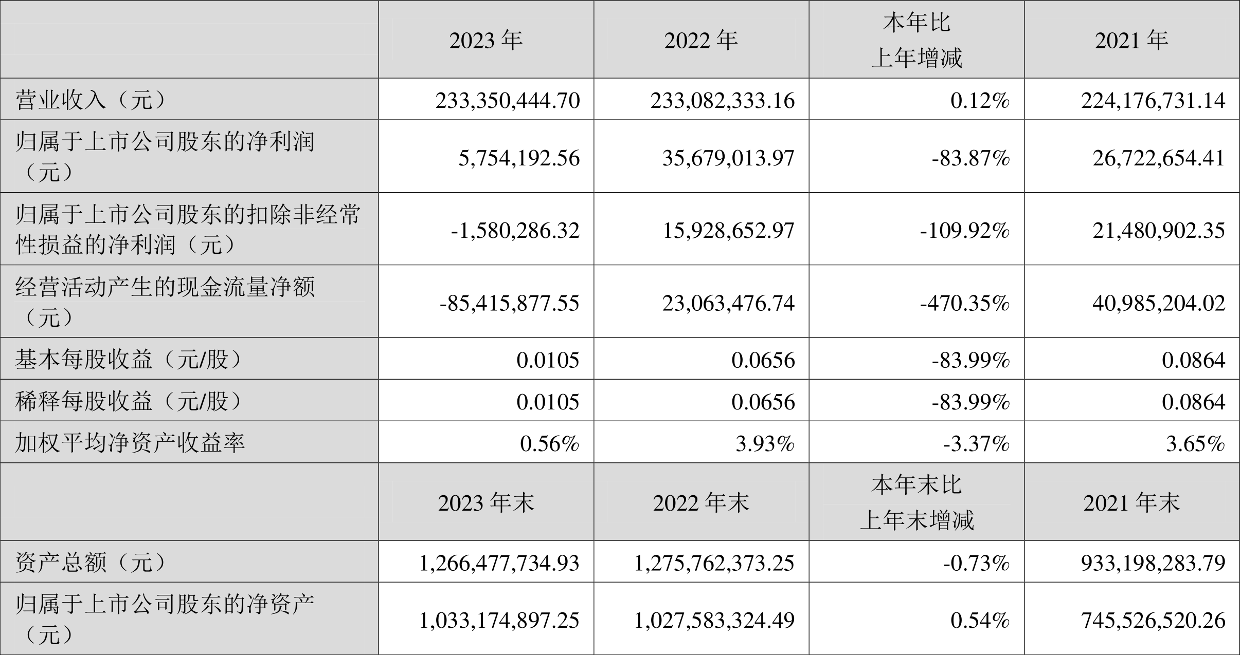 晨曦航空(300581)4月22日披露2023年年报。2023年,公司实现营业总收入2.33亿元,同比增长0.12%;归母净利润575.42万元,同比下降83.87%;扣非净利润亏损158.03万元,上年同期盈利1592.87万元;经营活动产生的现金流量净额为-8541.59万元,上年同期为2306.35万元;报告期内,晨曦航空基本每股收益为0.0105元,加权平均净资产收益率为0.56%。公司2023年年度利润分配预案为:拟向全体股东每10股派0.13元(含税)。
