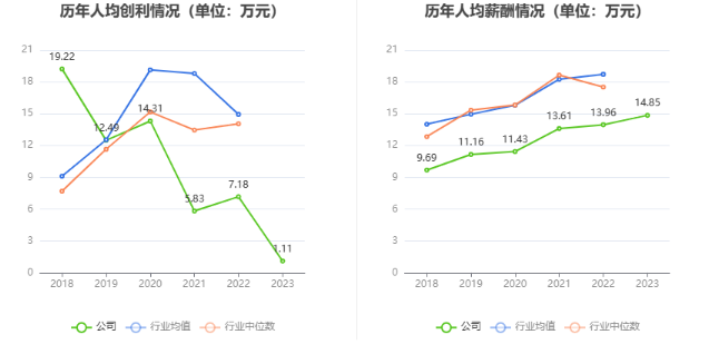 截至2023年末,公司员工总数为519人,人均创收44.96万元,人均创利1.11万元,人均薪酬14.85万元,较上年同期分别变化-4.13%、-84.56%、6.32%。