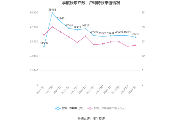 筹码集中度方面,截至2023年年末,公司股东总户数为3.92万户,较三季度末下降了1314户,降幅3.24%;户均持股市值由三季度末的13.38万元上升至13.79万元,增幅为3.06%。