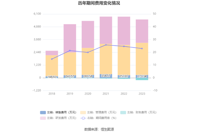 2023年,公司期间费用为5360.00万元,较上年同期减少389.07万元;期间费用率为22.97%,较上年同期下降1.70个百分点。其中,销售费用同比增长6.33%,管理费用同比增长6.26%,研发费用同比下降17.3%,财务费用由去年同期的-95.55万元变为-215.58万元。