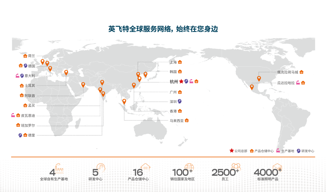 作为国际领先的照明系统解决方案提供商,英飞特电子始终坚持自主创新、持续深化全球化战略布局。公司产品远销100多个国家和地区,已构建起覆盖全球的营销与服务网络,实现数据协同与资源的高效配置。