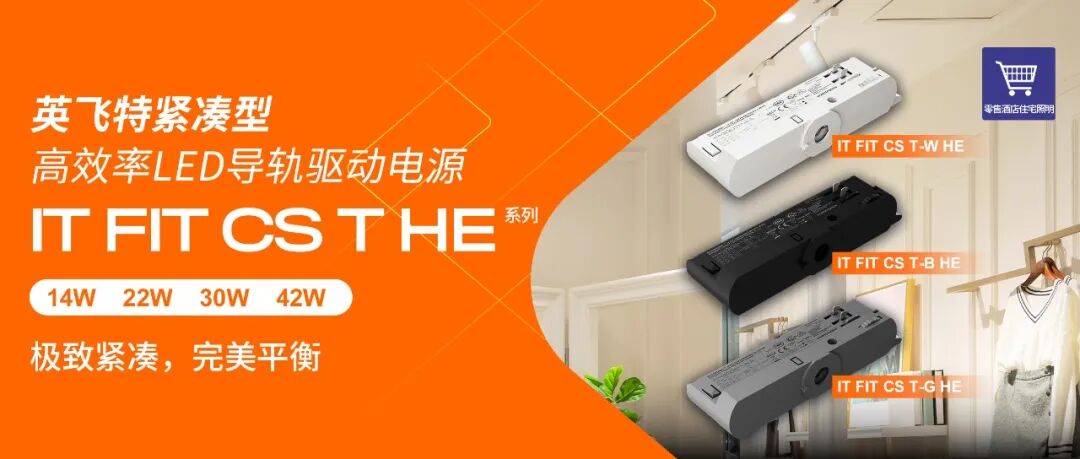 英飞特零售酒店住宅照明LED驱动电源IT FIT CS T HE,适用于4线3回路轨道,其输入电压范围为220~240Vac,以卓越效能与紧凑结构,重新诠释高效与美学的平衡,致力于为时装店、美妆店等高端零售场景提供可持续、高性能的电源解决方案。