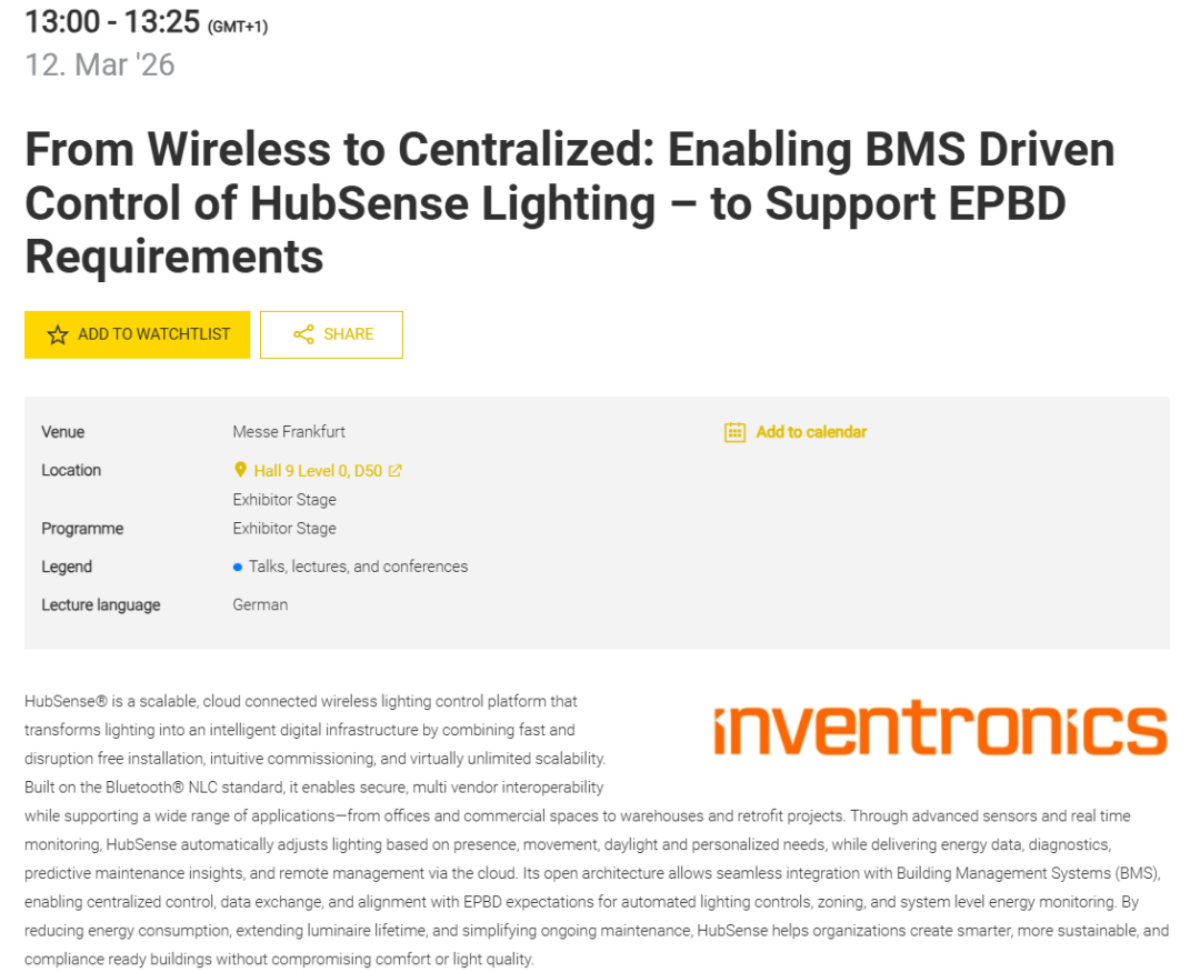 英飞特电子FAE欧洲区负责人- Matthias Bolm先生将于3月12日13:00-13:25(GMT+1)在Hall9 Level0, D50的Exhibitor Stage带来主题演讲:《From Wireless to Centralized: Enabling BMS Driven Control of HubSense Lighting - to Support EPBD Requirements》 。我们诚挚邀请您拨冗出席,与 Matthias Bolm 先生面对面交流,共同探讨智能照明的无限可能。