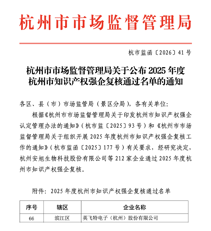 近日,杭州市市场监督管理局正式公布了2025年度杭州市知识产权强企复核通过名单。经审核,英飞特电子(杭州)股份有限公司成功通过复核。