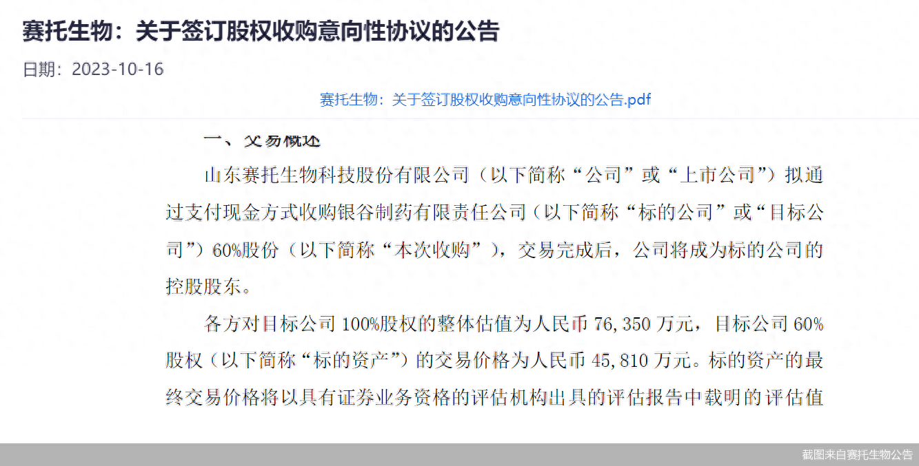 赛托生物表示,各方对银谷制药100%股权的整体估值为7.635亿元,目标公司60%股权的交易价格为4.58亿元,交易完成后,公司将成为银谷制药的控股股东。
