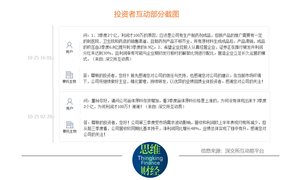 三季报显示,前三季度,赛托生物实现营收9.23亿元,同比下降1.04%,实现净利润6115.74万元,同比增加48.06%。