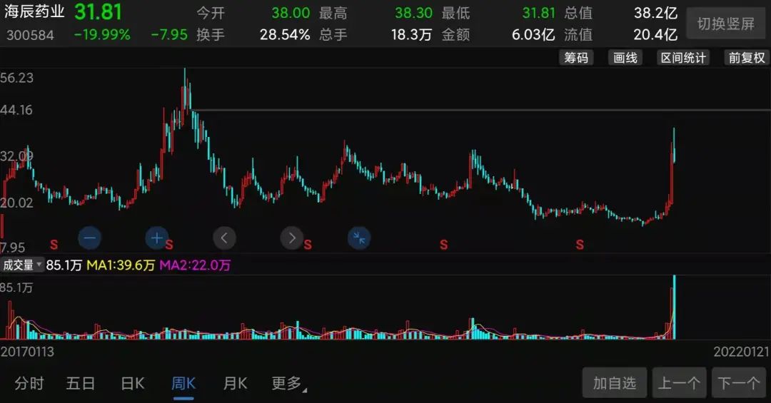 兼具幽门杆菌、新冠药两大热门概念的海辰药业,去年10月底的时候股价最低是14.93元,到现在最高是40.63元,最大涨幅172%,接近2倍。但是在股价创出40.63元的高位后,最近几天开启了“绞肉机”模式。