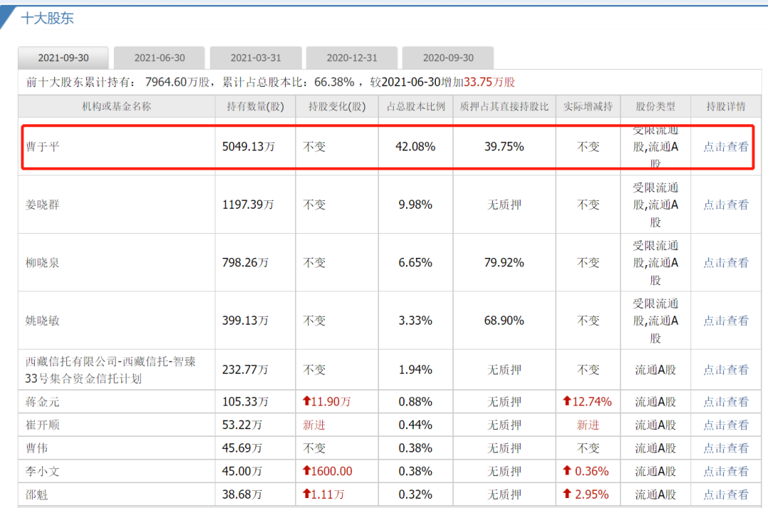 截止去年三季度末,公司前十大股东中,实控人曹于平质押比例达39.75%,第四大股东柳晓泉质押比例为79.92%,第6大股东质押比例为68.90%。