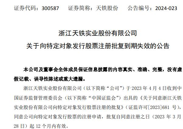 天铁股份(300587.SZ)昨日发布《关于向特定对象发行股票注册批复到期失效的公告》称,公司于2023年4月4日收到中国证监会出具的《关于同意浙江天铁实业股份有限公司向特定对象发行股票注册的批复》(证监许可[2023]681号),同意公司向特定对象发行股票的注册申请,批复自同意注册之日(2023年3月28日)起12个月内有效。