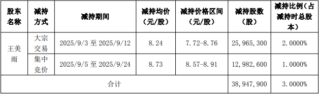 2025年9月3日至2025年9月12日,王美雨通过大宗交易方式减持25,965,300股,减持均价为8.24元/股;2025年9月5日至2025年9月24日,王美雨通过集中竞价方式减持12,982,600股,减持均价为8.73元/股。