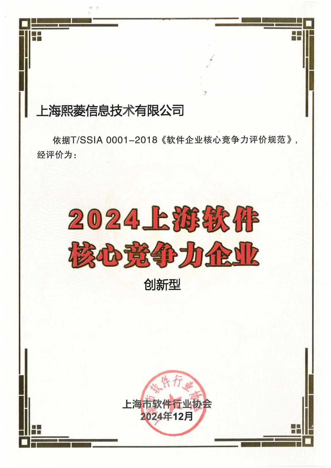 12月19日,由上海市软件行业协会主办,长三角国家技术创新中心、上海市软件评测中心有限公司等单位联合协办的2024上海软件创新论坛,公布了“2024上海市软件企业核心竞争力评价”结果,熙菱信息(股票代码:300588)获评“2024上海软件核心竞争力企业(创新型)”。