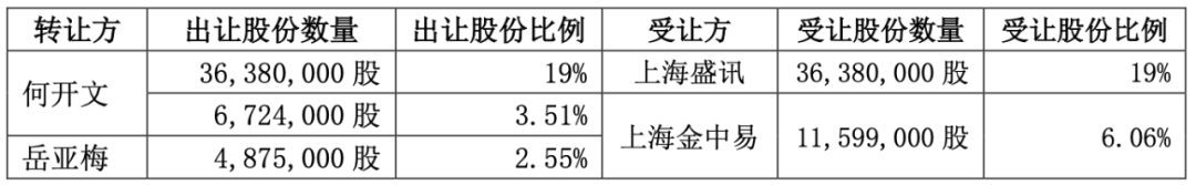 7月25日,熙菱信息进一步披露公告显示,何开文、岳亚梅与上海盛讯、上海金中易签署了《股份转让协议》。根据协议,何开文、岳亚梅将合计持有的11,599,000股无限售流通股(占总股本的6.06%)转让给上海金中易,其中何开文转让6,724,000股无限售流通股(占总股本的3.51%),岳亚梅转让4,875,000股无限售流通股(占总股本的2.55%)。
