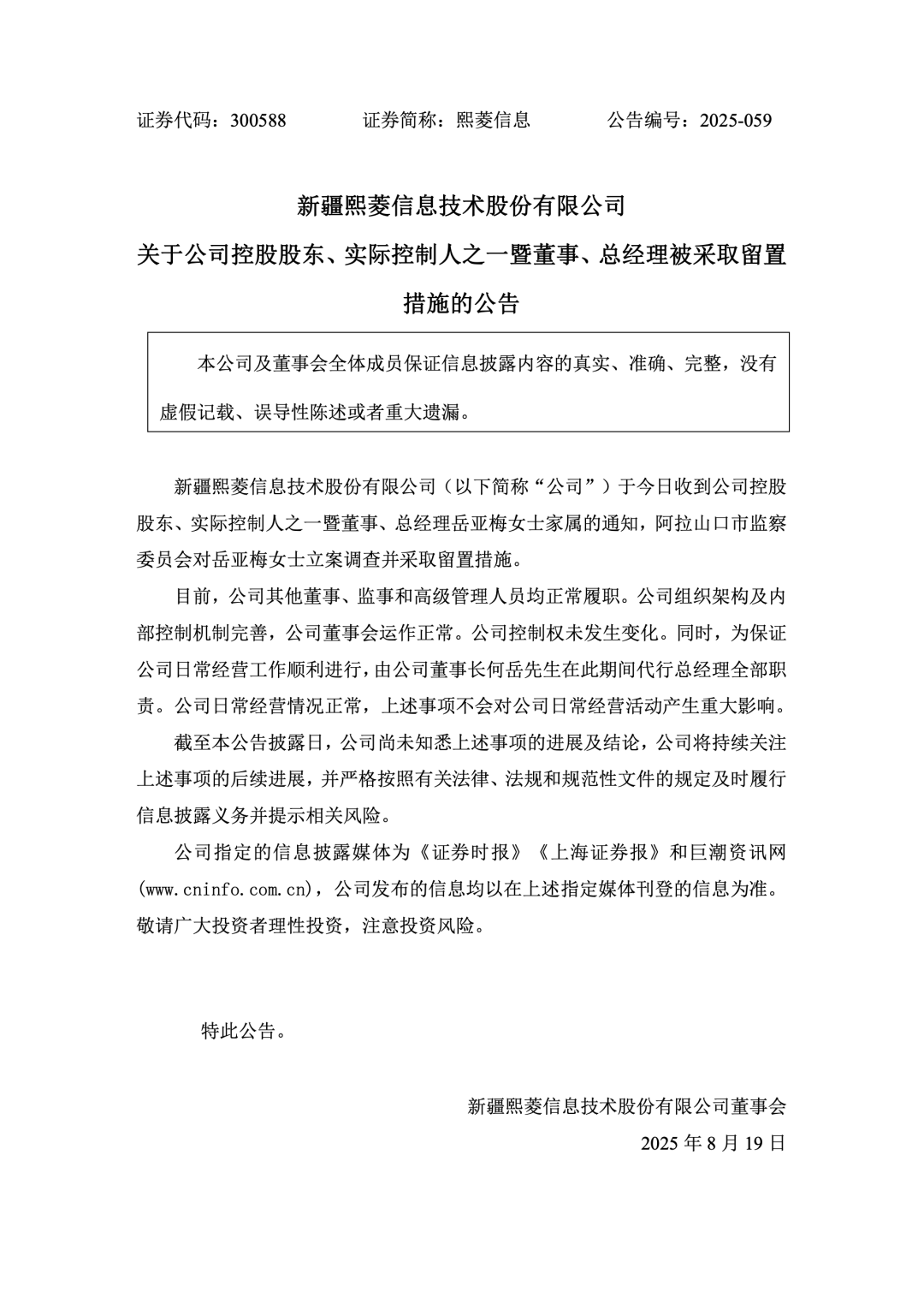 2025年8月19日晚间,新疆熙菱信息技术股份有限公司(以下简称“熙菱信息”,SZ.300588)发布一则公告,公司收到控股股东、实际控制人之一暨董事、总经理岳亚梅家属通知,阿拉山口市监察委员会对岳亚梅立案调查并采取留置措施。