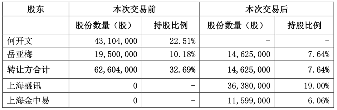 若本次权益变动完成,何开文将不再直接持有公司股份,岳亚梅的持股比例降至7.64%,两人合计持股比例降至7.64%。
