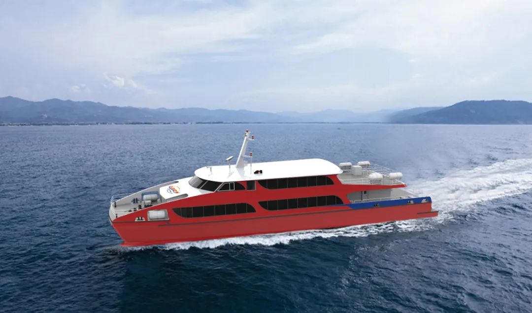该船为全铝合金双体结构高速客船,总长40米,型宽10.25米,型深3.5米,采用双机双桨推进,设计航速不小于29.5节,客位数299个,采用经典的中国红配色,客舱布局舒适宽敞,观景玻璃窗视野更为开阔,整船具有航行平稳、安静等特点,将进一步提升旅客乘坐的舒适感。